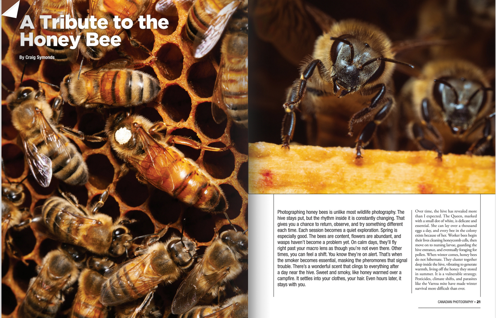 For Toronto’s CONTACT Photography Festival, Craig Symonds exhibited 'A Tribute to the Honey Bee' in collaboration with Melanie Coates aka BEEGrrl, a Toronto urban beekeeping pioneer who launched the world’s first rooftop hotel apiary on the Fairmont Royal York in 2008. The project highlighted the delicate balance between agricultural needs and the preservation of natural ecosystems, using honey bees as a platform for reflection. Recognized as part of the official World Bee Day celebrations by the United Nation’s Food and Agriculture Organization, the exhibition was produced with generous support from the Ontario Arts Council, an agency of the Government of Ontario.